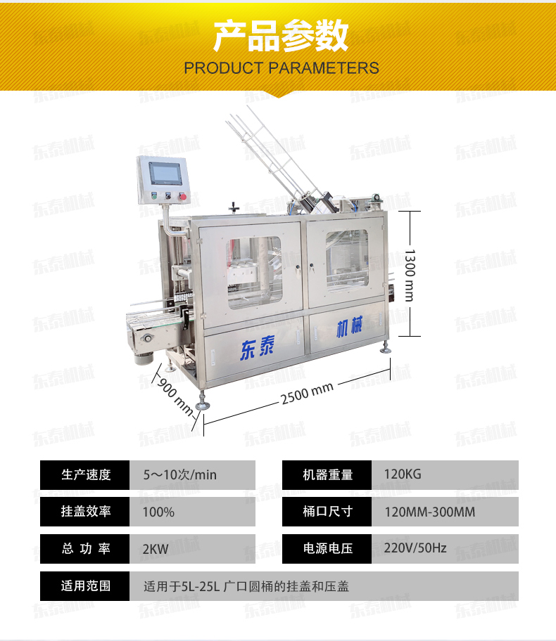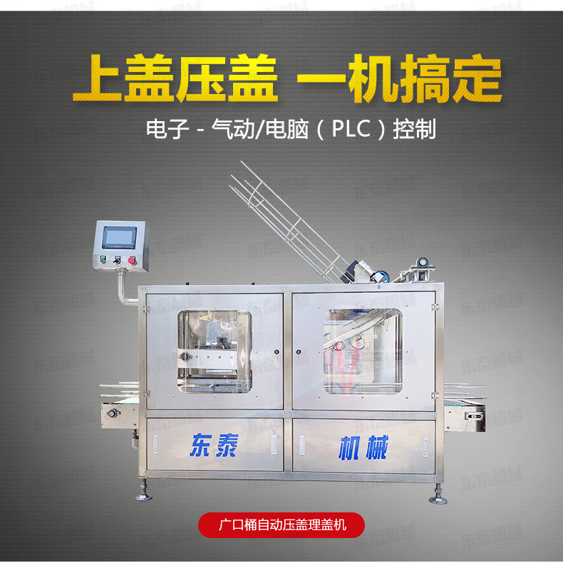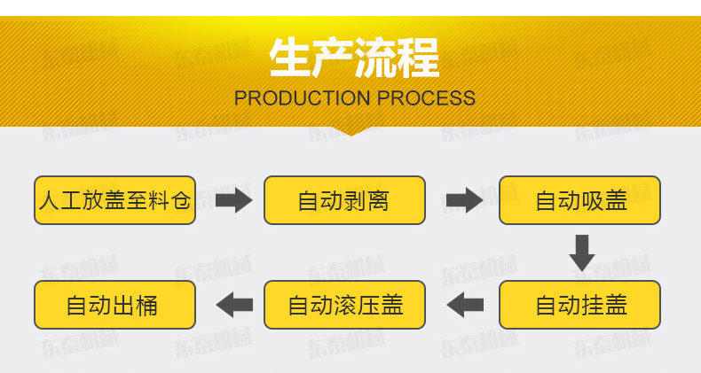 人工放盖至料仓——自动剥离——自动吸盖——自动挂盖——自动滚压盖——自动出桶——一个循环完成。