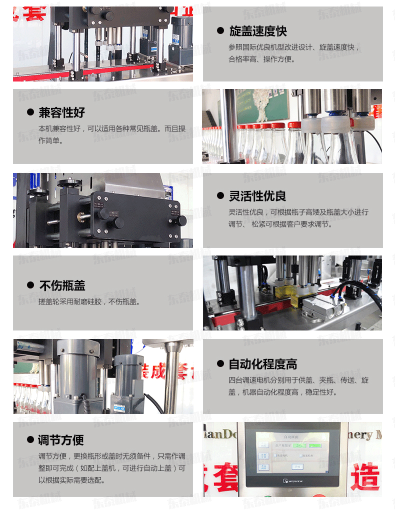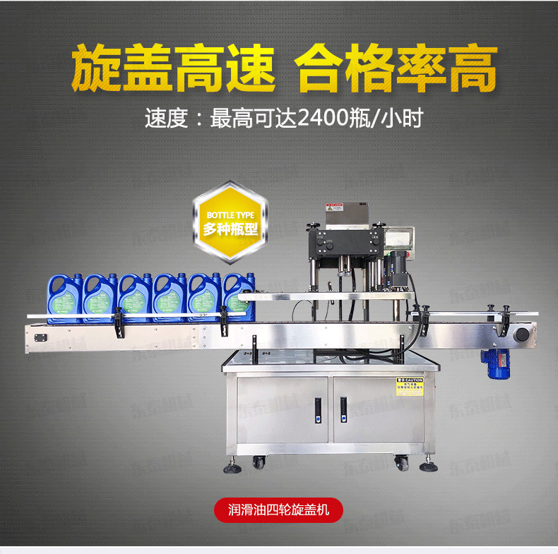 全自动旋盖机是参照国机型改进设计、旋盖速度快,合格率高、操作方便。可适用于食品、制药、日化、农药、化妆品等行业的不同瓶形的旋盖。四台调速电机分别用于供盖、夹瓶、传送、旋盖,机器自动化程度高,稳定性好,调节方便,更换瓶形或盖时无须备件,只需作调整即可完成(如配上盖机,可进行自动上盖)可以根据实际需要选配。