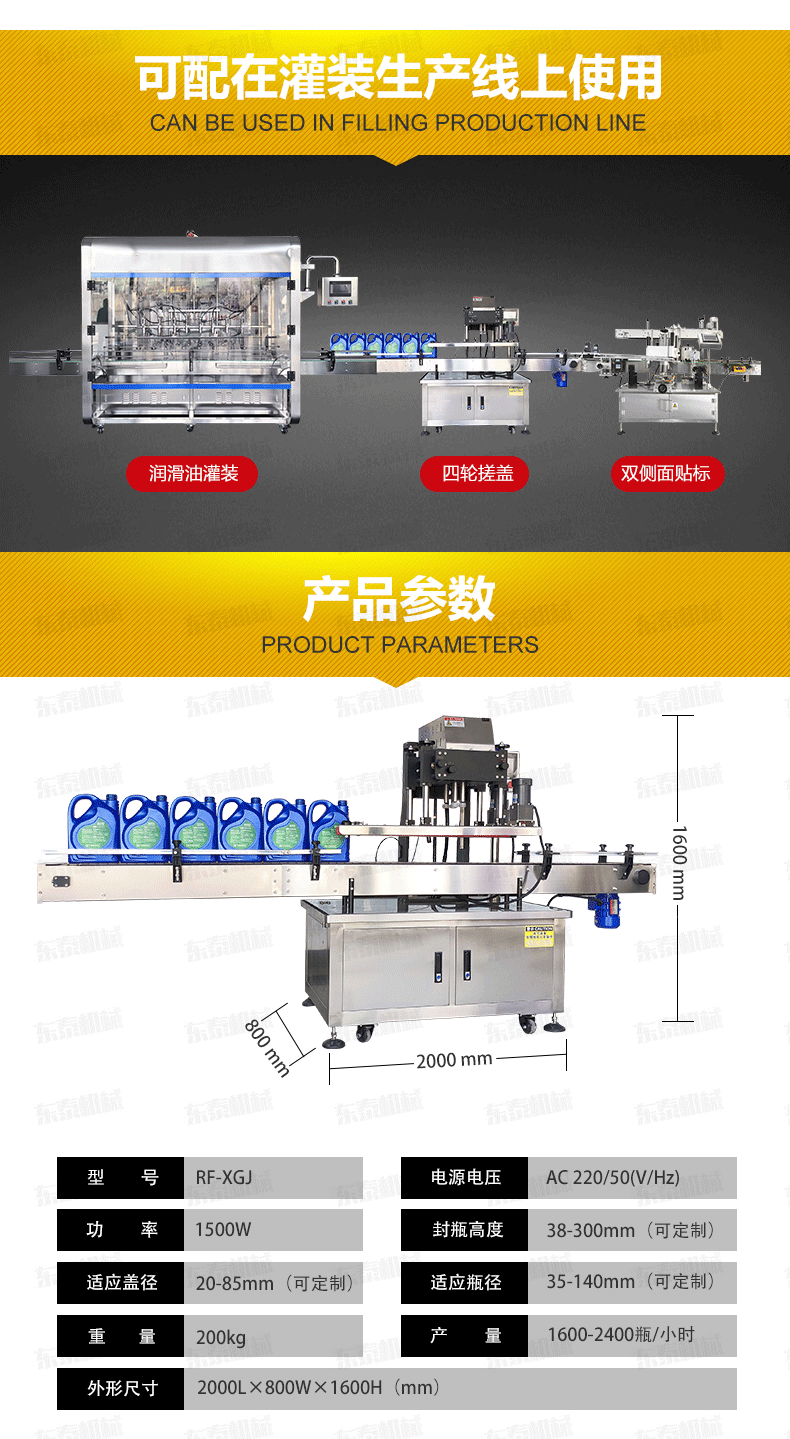 自动旋盖机原理:电气控制运动,稳定性强;设有定位装置,旋盖标准,操作方便;锁盖范围宽,可锁不同形状规格的瓶盖;解决了喷头、泵头、喷雾泵、手扣式喷头旋盖难的问题;锁盖转速可调,可根据不同瓶盖调节松紧度。