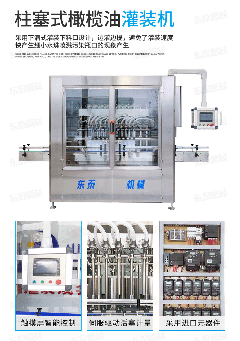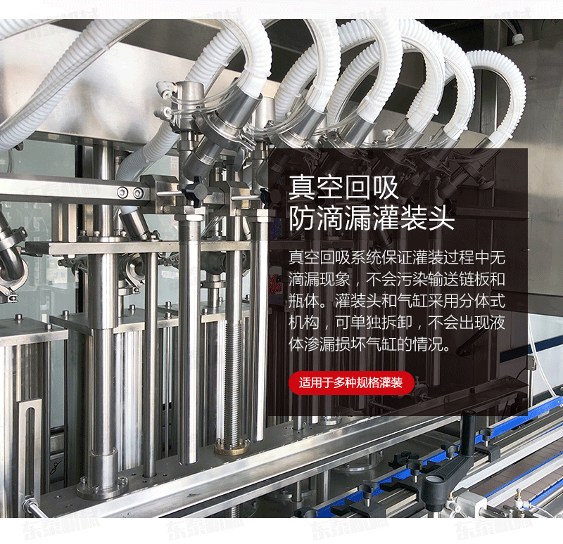 1.真空回吸系统保证灌装过程中无滴漏现象,不会污染输送链板和瓶体。灌装头和气缸采用分体式机构,可单独拆卸,不会出现液体渗漏损坏气缸的情况。进口亚德客气缸经久耐用,其他密封等配件使用标准件,更换维护简单方便。