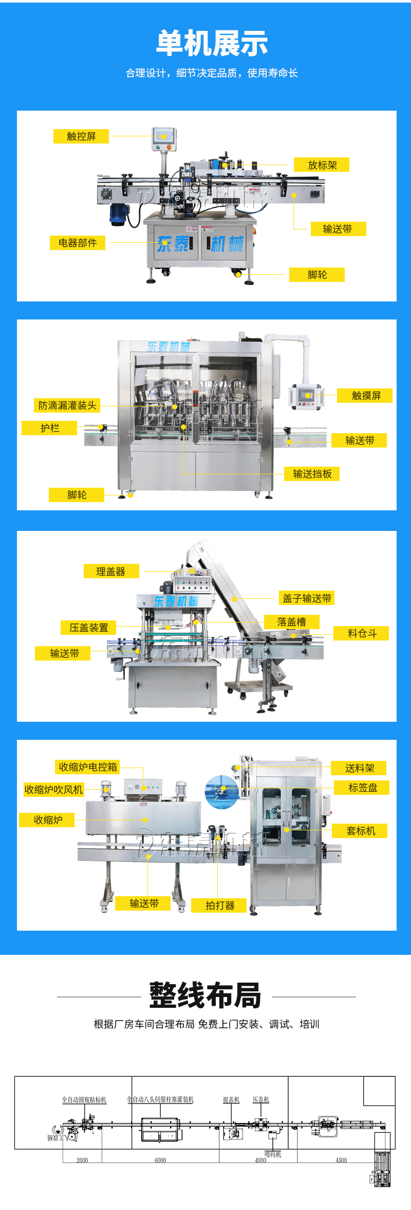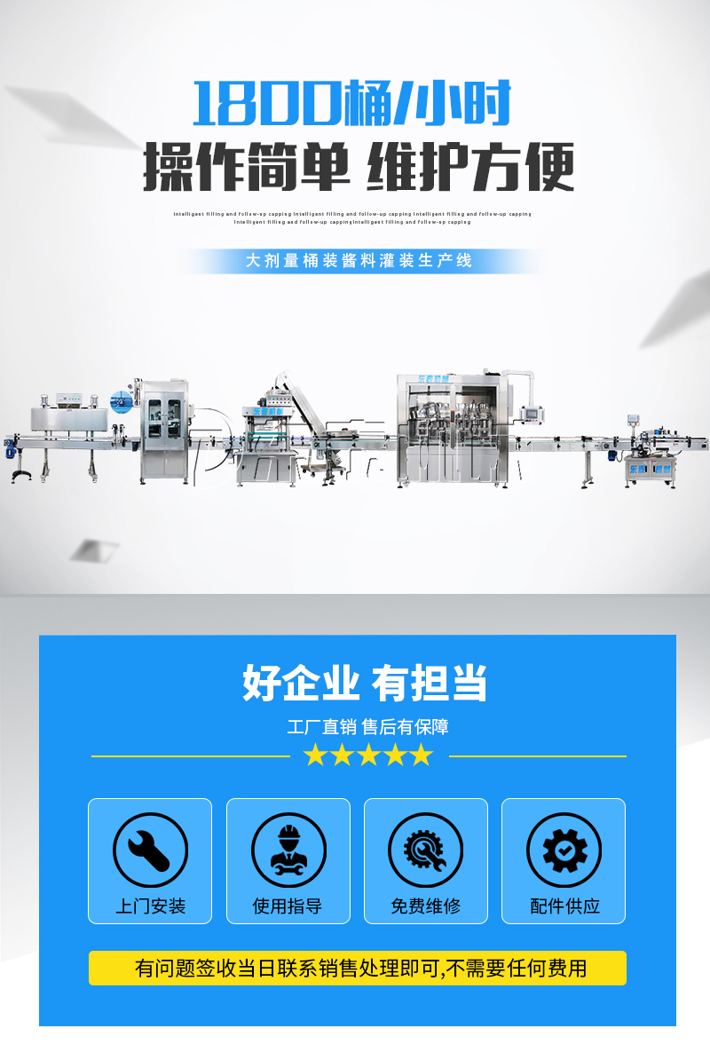 产品简介: 该系列灌装机采用活塞式伺服系统驱动原理,适用于粘流体中带小颗粒并且可流动的较为粘稠的物料灌装。比如:洗衣液、洗洁精、甜面酱、沙拉酱、芝麻酱、食用油等的灌装。设备采用伺服系