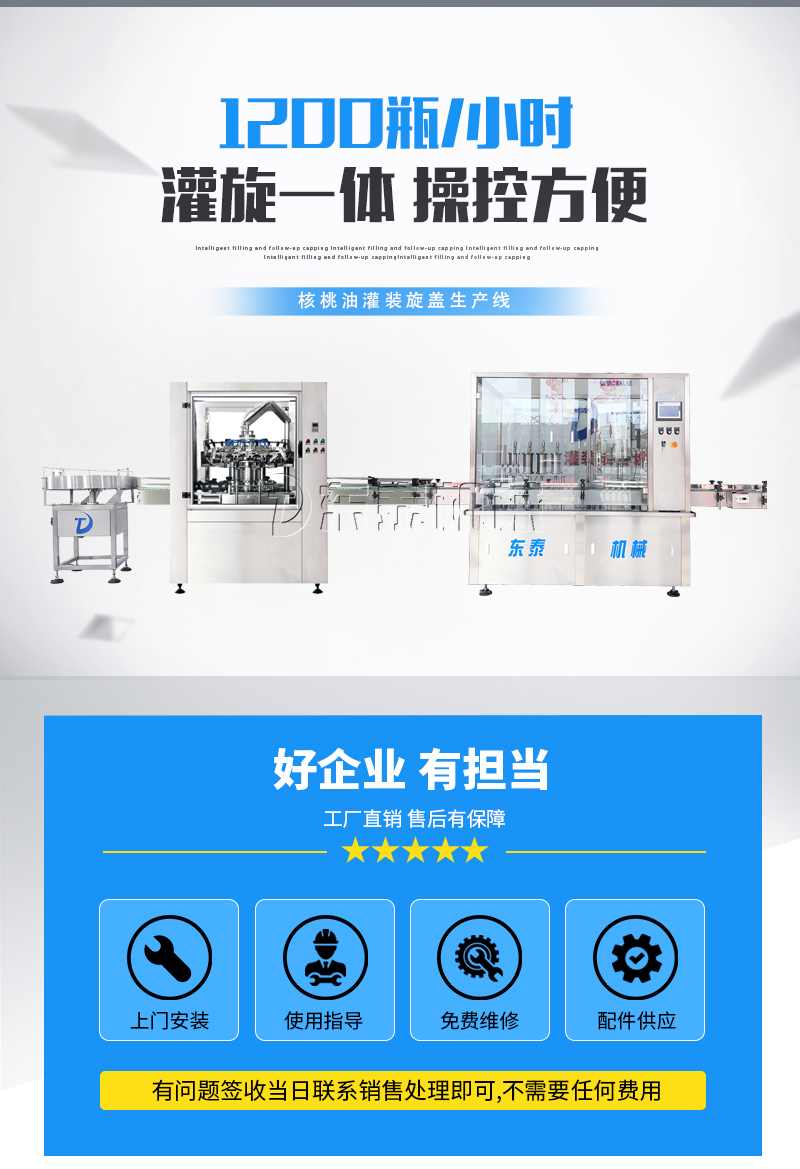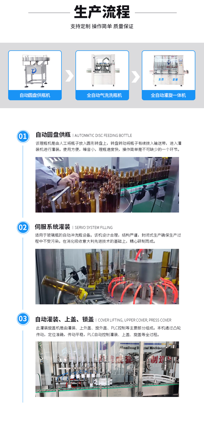 本灌装流水线设备具有稳定可靠、自动化水平高,相比同类产品有着更长的使用年限,维护简单,整线中各设备的协调性、连贯性强,整线设计合理等特点。灌装设备采用独家专利系统结构,为当今行业内水平,整