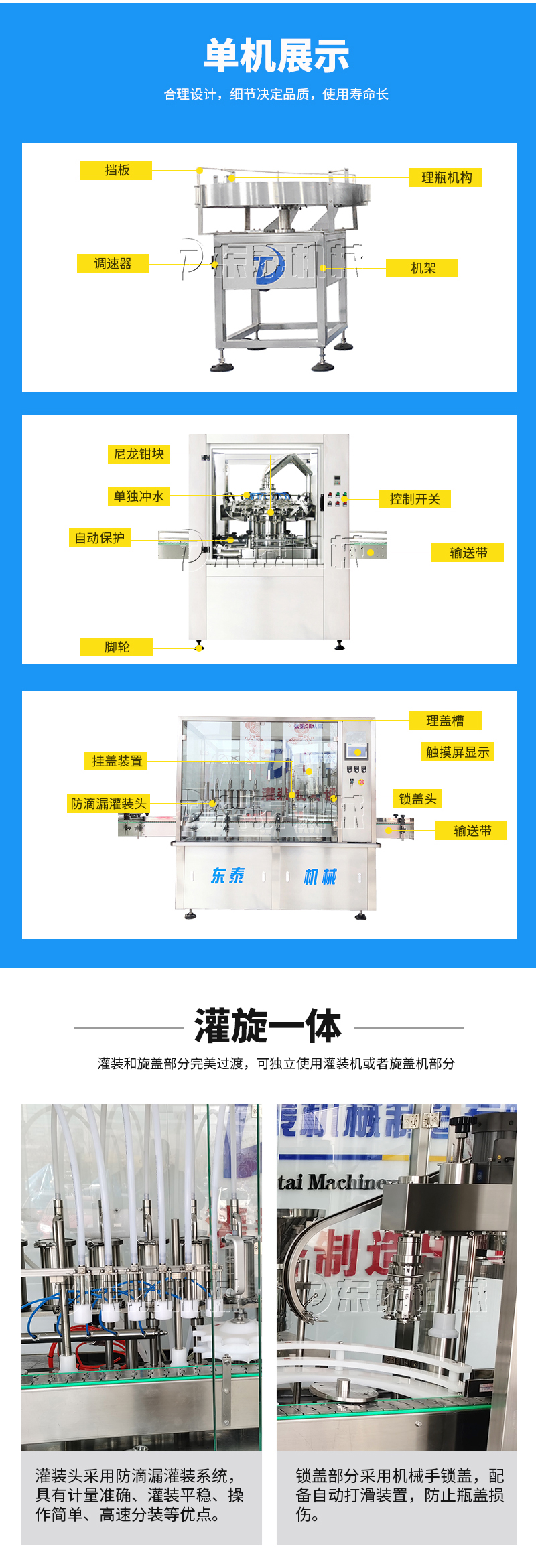 本灌装流水线设备具有稳定可靠、自动化水平高,相比同类产品有着更长的使用年限,维护简单,整线中各设备的协调性、连贯性强,整线设计合理等特点。灌装设备采用独家专利系统结构,为当今行业内水平,整线满足量产化、集成化生产的需要。