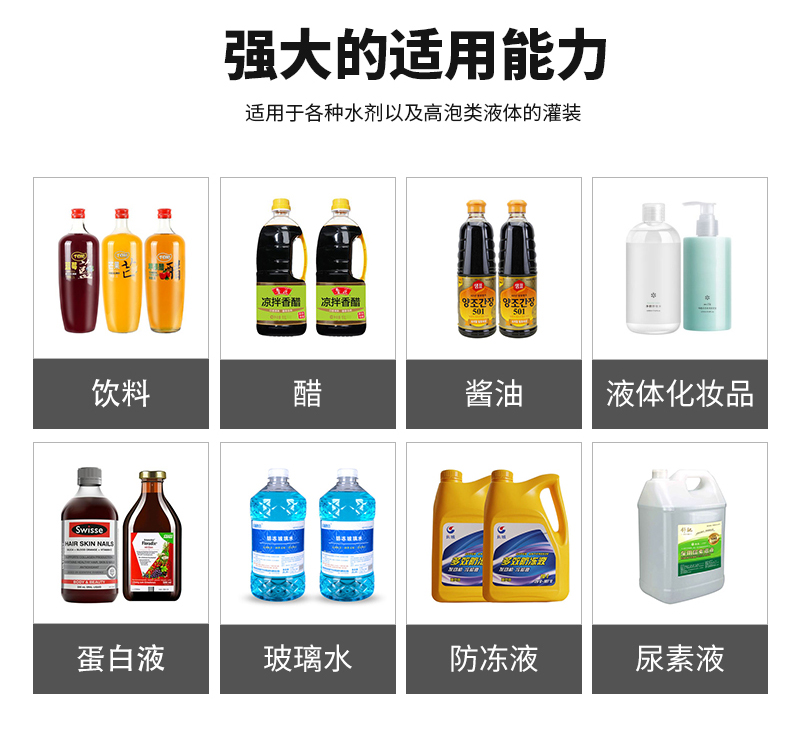 双头液体定量灌装机适用于各种水剂以及高泡类液体的灌装。如:饮料、醋、酱油、液体化妆品、蛋白液、玻璃水、防冻液、尿素液等