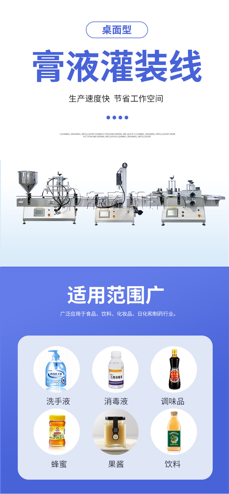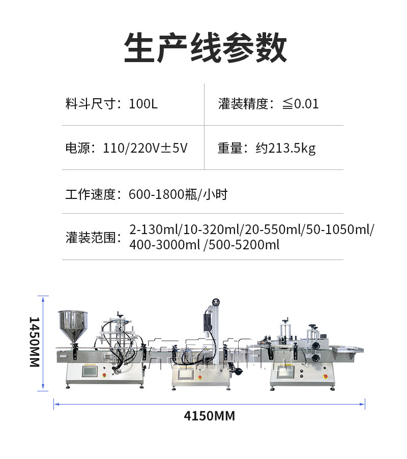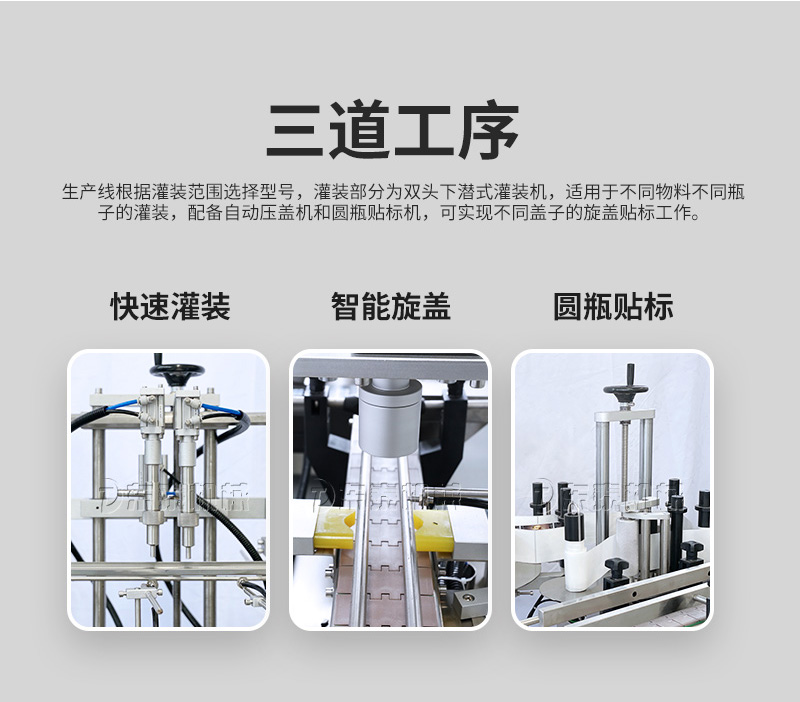 产品说明:生产线根据灌装范围选择型号,灌装部分为双头下潜式灌装机,适用于不同物料不同瓶子的灌装,配备自动压盖机和圆瓶贴标机,可实现不同盖子的旋盖贴标工作。 本设备主要适用于食品、日常化工