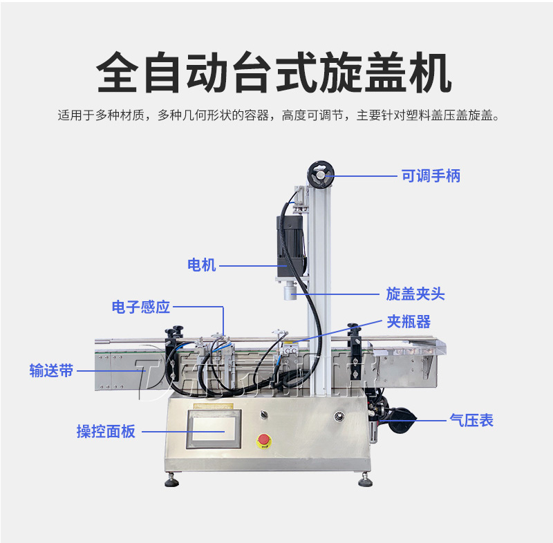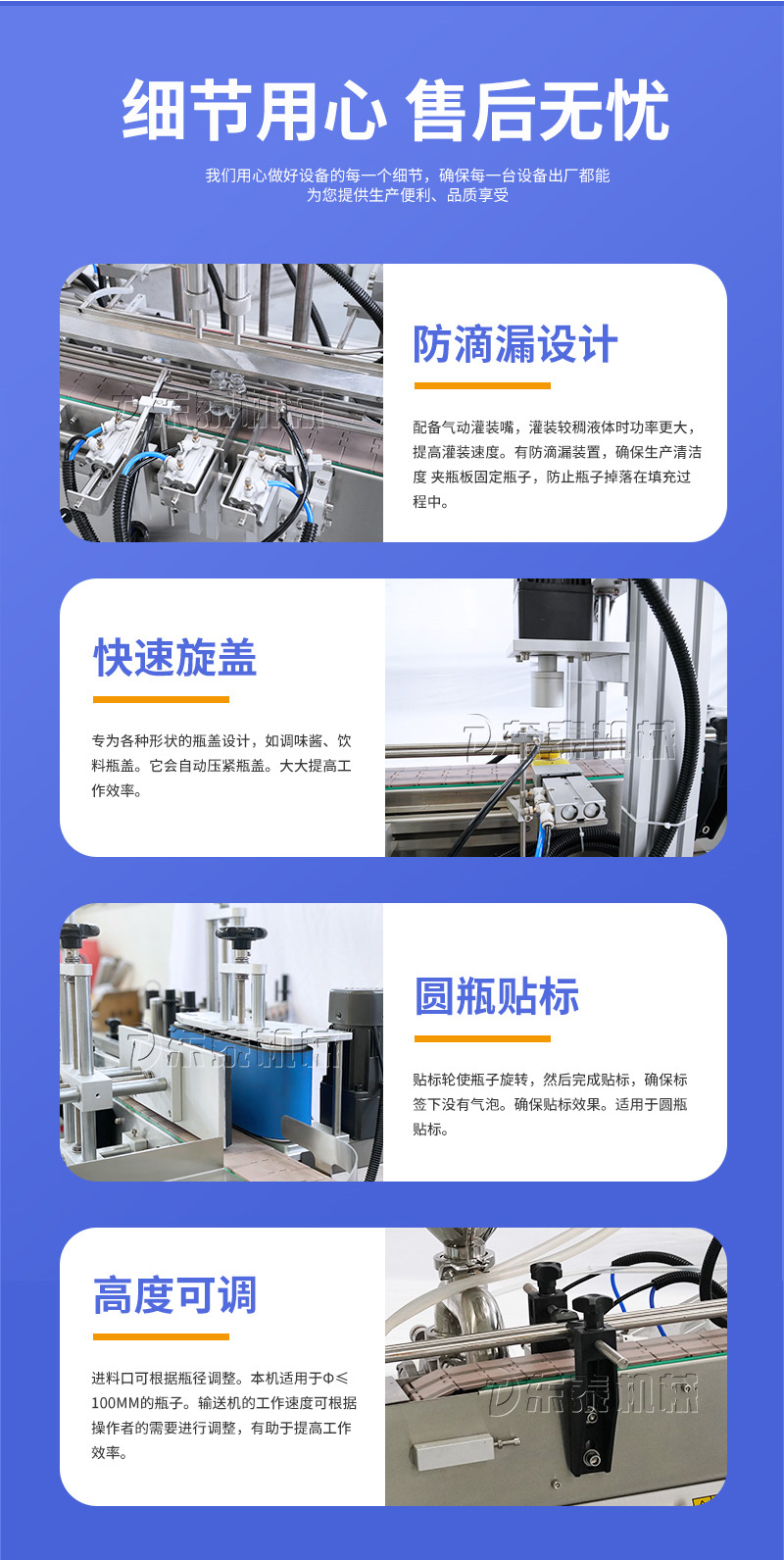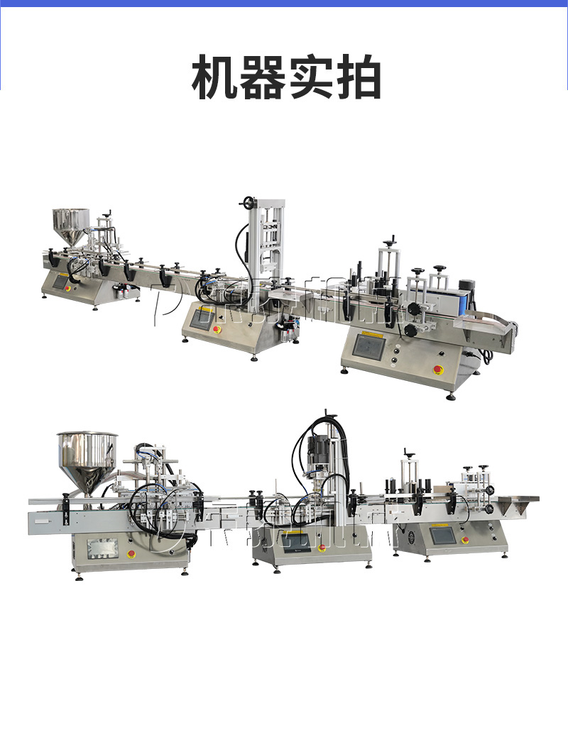 产品说明:生产线根据灌装范围选择型号,灌装部分为双头下潜式灌装机,适用于不同物料不同瓶子的灌装,配备自动压盖机和圆瓶贴标机,可实现不同盖子的旋盖贴标工作。