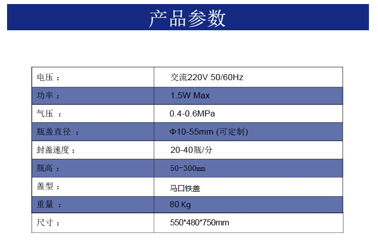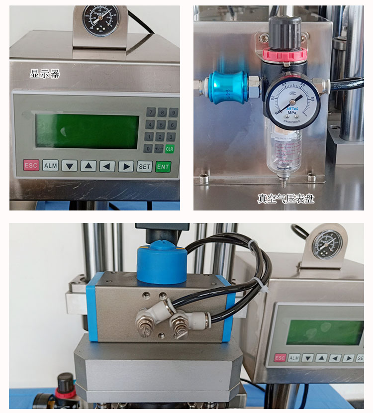 半自动玻璃瓶真空旋盖机一款适用于食品罐头行业玻璃瓶马口铁爪式旋开盖真空包装的设备,采用气动驱动旋盖,采用精确控制执行件气压实现扭矩控制,非摩擦式扭力限制使使用寿命更长;由于采用可靠的全密封技术,配置小功率真空泵即可达到理想的真空度,真空度可按需设定。具有经济性、广泛适用性、易用性、可靠性和移动性,适合小型生产车间、特殊规格用途、以及实验室使用。