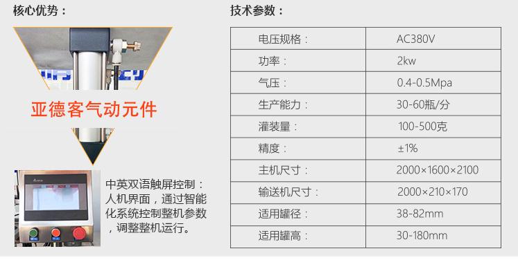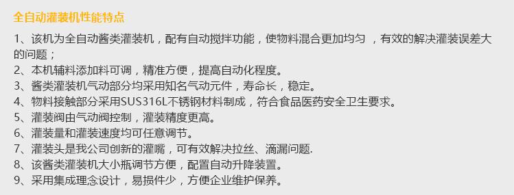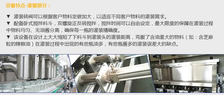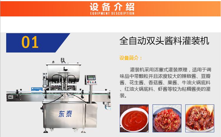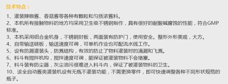灌装机采用活塞式灌装原理,适用于调味品中带颗粒并且浓度较大的辣椒酱、豆瓣酱、花生酱、香菇酱、果酱、牛油火锅底料、红油火锅底料、虾酱等较为粘稠酱类的灌装。