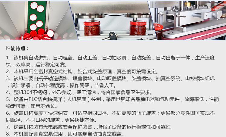 1、该机集自动进瓶、自动理盖、自动上盖、自动抽吸真,自动旋盖,自动出瓶于一体,生产速度快,效率高,运行稳定可靠。