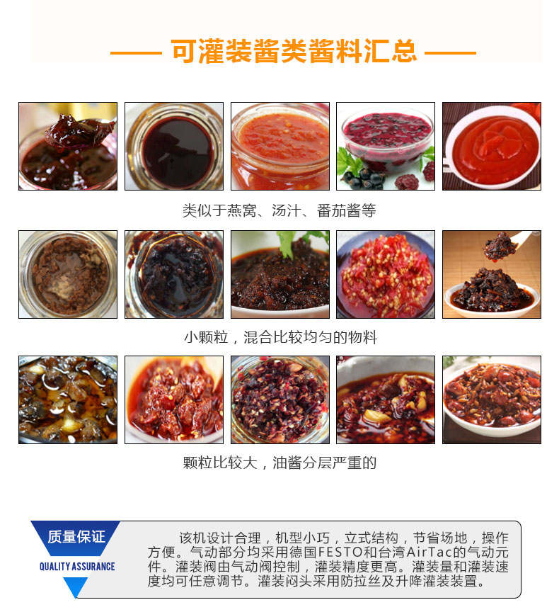 随着机械技术的快速发展灌装机的发展也是日新月异,使得其种类比较多。蘸酱在我国拥有悠久的历史,在我国烹饪中占有着重要的地位,发展到现在在做菜和食品中也不可或缺,巨大的市场使得蘸酱灌装机拥有巨