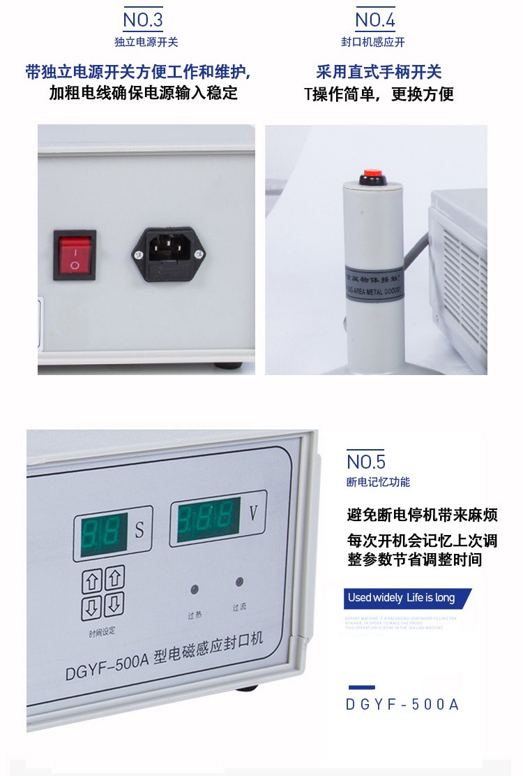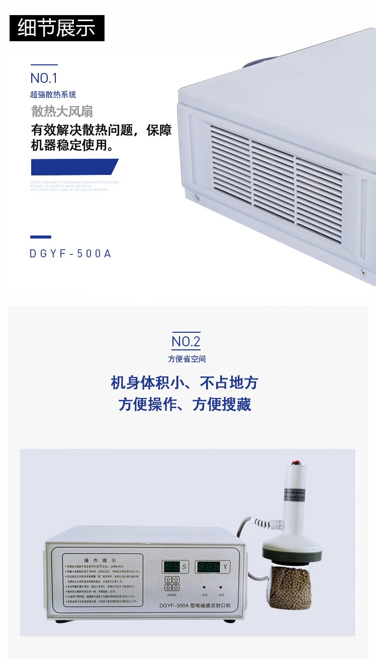 该封口机是一种便携式电磁感应加热封口设备,专为制药、化工、农药、食品、化妆品、轻工行业对容器进行铝箔严密封口。封口材质使用广泛,可以是聚乙烯、聚丙烯、聚苯乙烯、聚酯以及玻璃瓶,但不能用于金属瓶体及瓶盖。本机小巧轻便,使用简单,适用于小批量生产和实验室作业。本机采用国外先进线路,选用日本最新模块化功率器件,较于一般电子感应加热器更省电,热效率达到90%以上,瞬时加热速度为后者的20-30倍,因此不仅适用于热封性能较好的聚乙烯、聚丙烯材质的瓶体,而且对热封性能较差的聚酯瓶、玻璃瓶也有极好的封口效果。