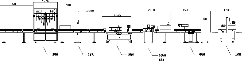 | 方案设计一:灌装机+压盖机+贴标机+自动胶帽热缩机+喷码机+封箱机 |