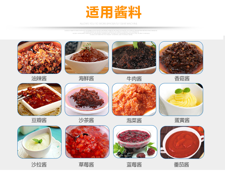 灌装机采用活塞式灌装原理,适用于调味品中带颗粒并且浓度较大的辣椒酱、豆瓣酱、花生酱、香菇酱、果酱、牛油火锅底料、红油火锅底料、虾酱等较为粘稠酱类的灌装。
