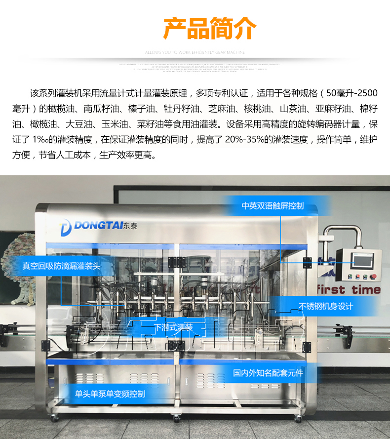 东泰机械至今有着二十年的研发生产经验,拥有着精良的技术团队,东泰研发的橄榄油自动灌装机,橄榄油灌装流水线都是机电一体的新型设备,橄榄油自动灌装机计量采用高精度流量计与微电子数控仪表相结合的方式,灌装精度相当高,还可以方便的进行无级调解灌装容量,非常直观,操作非常简单。选择包装设备就要选经验丰富、技术超前,设备完善的的大企业,东泰机械通过二十多年的努力和发展,现已成为集科研、设计制造、成套供应、技术咨询服务、工程总承包为一体的高科技型企业。东泰期待与您的合作,我们互利共赢!